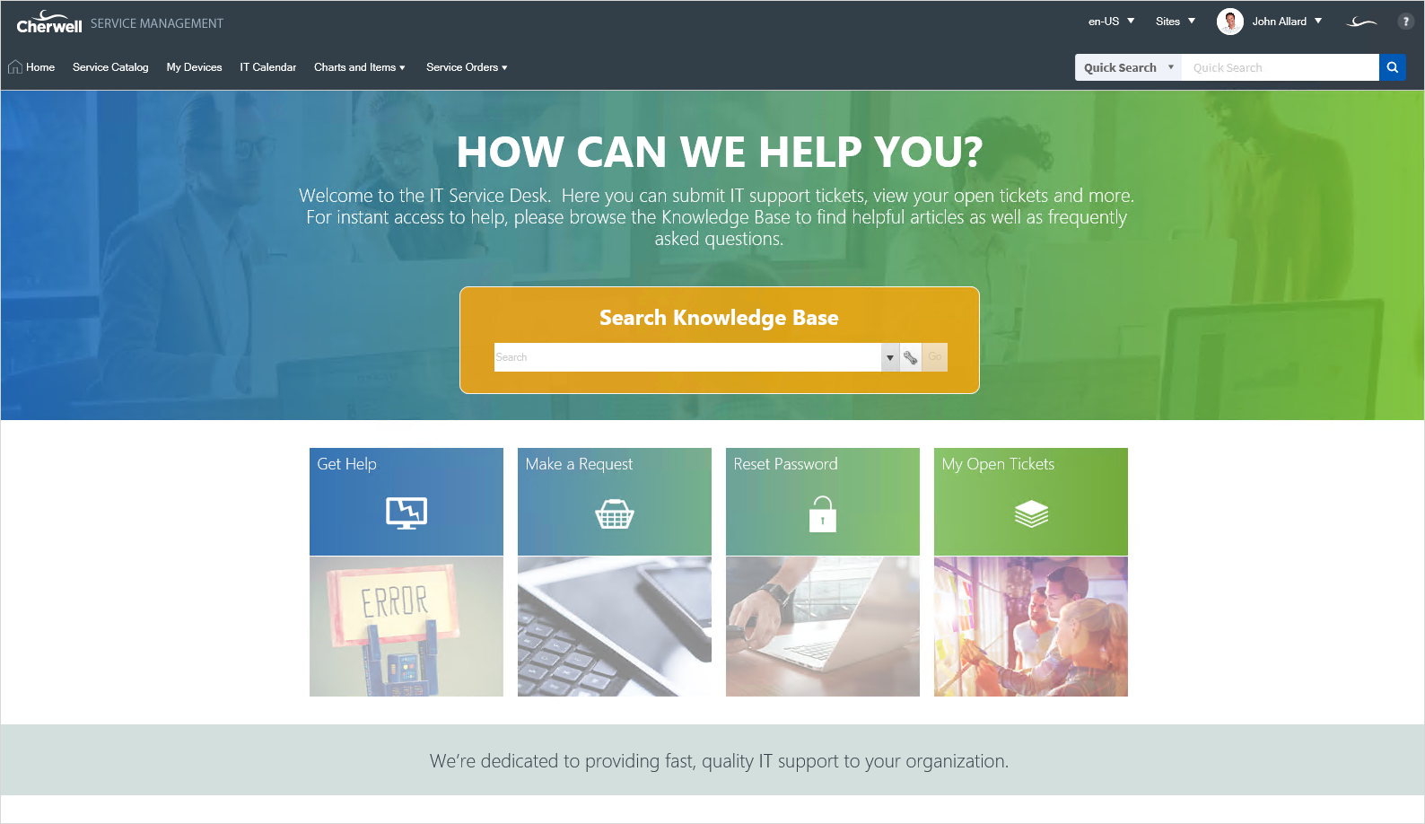 To help get your system started, CSM provides an OOTB IT Portal Site. The Site is built using OOTB Site Items, such as an OOTB Service Catalog, forms specific to the Portal, Dashboards specific to the service desk, and predefined properties (header/footer, menu bar, etc.). Implement and use the OOTB IT Portal Site as-is, modify it, or create new Sites to meet the needs of your organization.