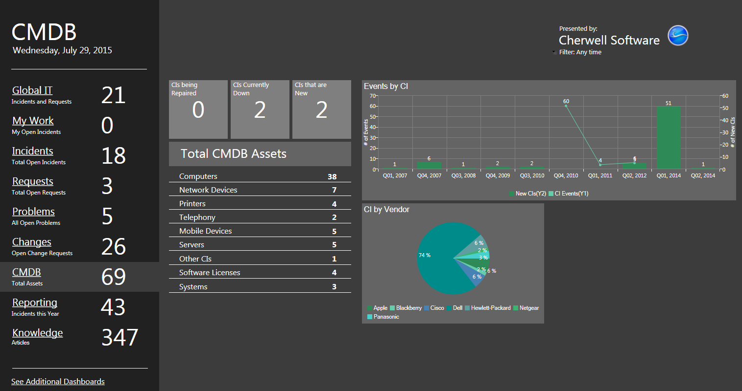 CSM provides a OOTB CMDB Dashboard that intuitively organizes your critical CI metrics into a single, real-time, at-a-glance CMDB control panel.