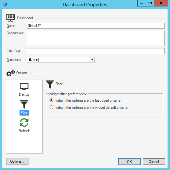 A Dashboard's Filter properties define whether or not filtering is persistent (that is, whether or not the Dashboard remembers the last filter you used and automatically displays it the next time you view the Dashboard, even between sessions). If persistence is not defined, the Widget's default filtering criteria is used each time the Dashboard is accessed.