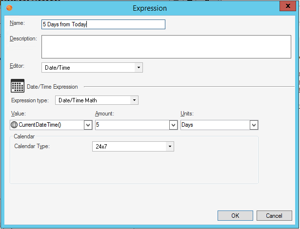For example, selecting CurrentDateTime() in the Value field, typing 5 in the Amount field, and selecting Days in the Units field will return a value of 5 days from now.