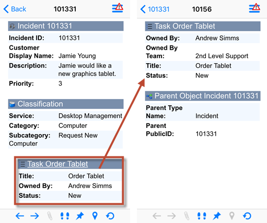 Depending on the type of device, Cherwell Mobile offers different navigation features for indicating your current position in a drill-down and returning to previous locations.