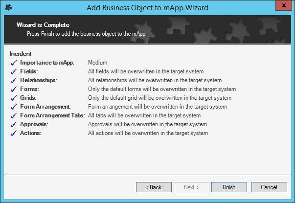 The Business Object and its associated Fields, Relationships, Forms, Grids, and Form Arrangements are added to the mApp Solution. When the mApp Solution is applied, these definitions will be imported into a target system according to the selections you made.