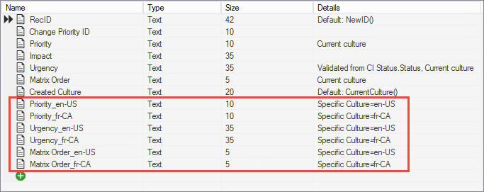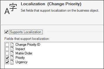 A current culture Field is used when localization is enabled for a specific Field. For example, if you enable localization for the Priority and Urgency Fields for the Change Priority Lookup Object, these are considered the current culture Fields. The value of the current culture Field is based on the User's currently selected culture.