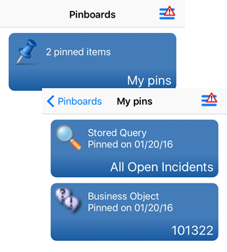 Cherwell Mobile allows you to define Pinboards for pinning items that you reference frequently so that you can easily revisit them. The pin acts like a shortcut to the associated item. You can create multiple Pinboards and pin Business Objects, searches, Dashboard Widgets, etc. For example, you can create a Pinboard for Incidents that you need to investigate and pin specific records or searches for Incidents assigned to you.